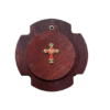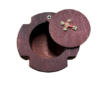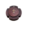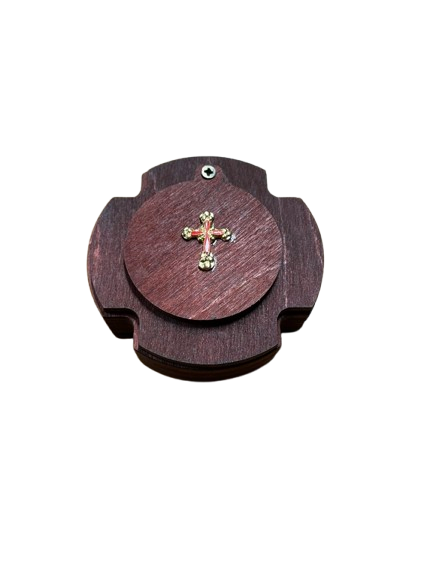 The reliquary is a traditional Orthodox container for preserving holy relics, fragments of saints’ clothing, or other consecrated objects. This elegant box has a trefoil shape symbolizing the Holy Trinity, with a hinged circular lid secured by a small screw. At the center of the lid is mounted a gold-plated metal Orthodox cross with red enameled center and decorative endings on each arm of the cross. The box is crafted from dark wood (mahogany or dark walnut) with a natural finish highlighting the rich grain of the wood.
